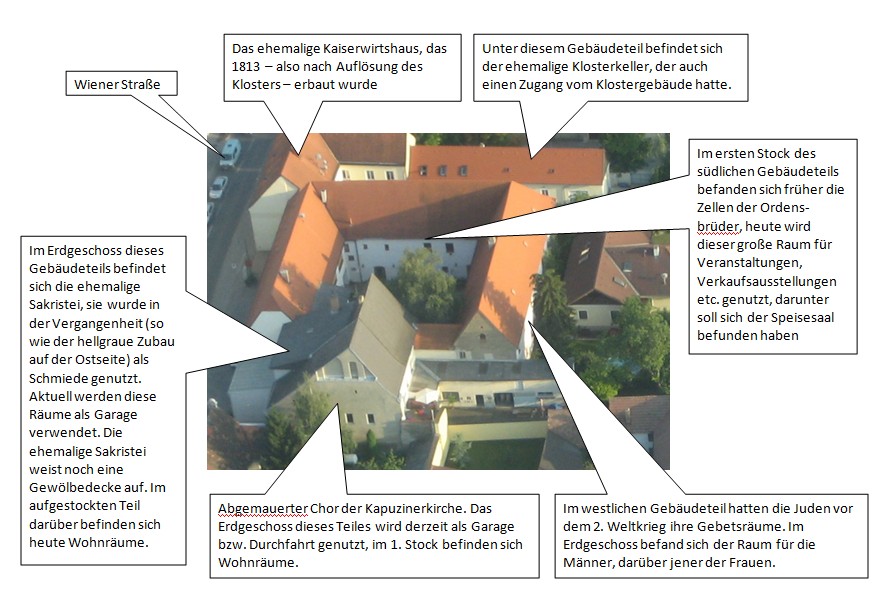 So konnte einwandfrei festgestellt werden, dass das Presbyterium der Kirche im rechten Teil des Hauses Rieder (heute Wessely - Haus Wiener Straße 10) befand, deutlich noch am Gewölbe zu erkennen, das niedriger war als des Hauptschiffes. Hier wurde eine Decke eingezogen, wodurch ein erster Stock entstand, und das Presbyterium nach außen hin (Nordseite) sozusagen abgemauert. Daher sind dort verschiedene Bögen zu erkennen. Die Werkstätte der Schmiede Wessely war die Sakristei und die darüberliegenden Räume im ersten Stock bildeten ein Oratorium hinter dem Hochaltar (Wiener Straße 12). Im Hause Wiener Straße 18 (linker Hausteil Zangl) befand sich zu ebener Erde das Reflektorium, der Speisesaal, daneben die Küche, durch ein Guckloch verbunden. Über diesem großen Raum hatten die Brüder ihre kleinen Zellen, deren Einteilung noch deutlich an der Holzdecke feststellbar ist. Eine Tür führte weiter in des Westtrakt, wo die Bibliothek gewesen sein könnte. Der Brunnen mit seiner steinernen Umfassung steht noch in der Mitte des geräumigen Klosterhofes.